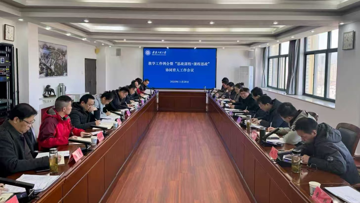 王成军指出,“思政课程”是落实立德树人根本任务的关键课程,而“课程思政”则是打通育人“最后一公里”的重要抓手,必须坚持 “一盘棋”思想,要打破学院、专业、课程之间的壁垒,推动知识传授、能力培养与价值引领有机融合,使各类课程与思政课程同向同行,形成良好协同效应。他强调,教学安全是学校一切工作的基础和前提,必须牢固树立“安全第一”的思想,加强对课堂教学、教材选用、实验室等各类教学阵地的管理,确保教学内容正确、政治方向无误,实验室、实训基地等教学场所无安全隐患;要与时俱进,优化人才培养方案与教学大纲,紧密结合国家战略需求、行业发展动态及学校办学定位,对照专业认证标准和审核评估专家反馈意见,系统性优化课程体系,更新教学内容,确保培养方案与教学大纲的科学性、前沿性与可操作性;要持续强化教风、学风、考风建设,落实好新教师能力提升“123”工程工作,引导教师热爱教学、倾心教学、研究教学,同时,加强对学生的学业指导和课堂管理,激发学习内生动力,不断提升学生学习效果。他要求各教学单位及时将本次会议精神传达到位,统一思想,提高认识,不折不扣地落实各项工作部署要求。