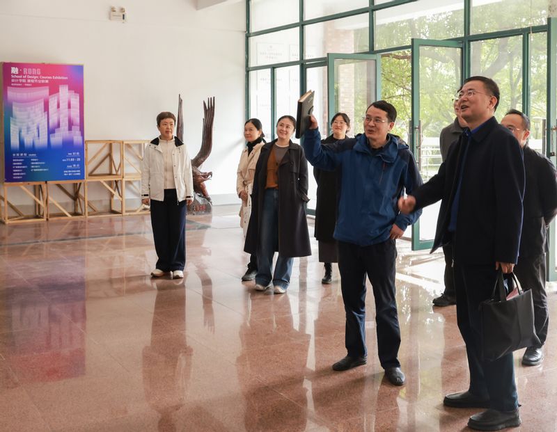 督查过程中,按照学院规划考察路线,黄友锐先后考察了7教一楼课程作业展厅、二楼获奖作品陈列厅、8教一楼工艺美术作品展区以及土木实验室与包装实验室等场所。